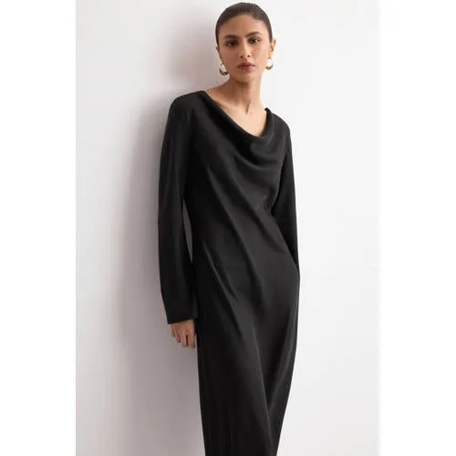 Ga voor een elegante avondlook met deze satijnen Mango jurk in diepzwart. Het rechte, langere ontwerp volgt subtiel je silhouet, terwijl de midi lengte zorgt voor een moderne, stijlvolle uitstraling. De glanzende stof vangt het licht op een mooie manier, perfect voor diners, feestjes of een speciale gelegenheid in de avond.Verfijnde details voor een avond uit Lang, recht design met midi lengte voor een tijdloze en nette uitstraling Lange, rechte mouwen die je armen op een subtiele manier bedekken Gedrapeerde watervalhals die zacht valt en het decolleté elegant accentueert Satijnachtige stof met een zachte glans voor een luxe gevoel op de huid Ritssluiting aan de achterkant en knoopsluiting in de nek voor een nette, aangesloten pasvorm Ontwerp zonder zakken voor een strakke, vloeiende lijnIdeaal voor avondjurken en midi looksDeze midi avondjurk komt het beste tot zijn recht met een paar hakken of elegante laarsjes. Door de rechte pasvorm en de langere zoom voelt de jurk comfortabel aan, terwijl de watervalhals je look direct meer diepte en beweging geeft. Voeg een subtiele ketting of oorbellen toe en je outfit is compleet.Mango: moderne mode met een verfijnde twistMango staat bekend om mode die trends op een toegankelijke manier volgt. Met aandacht voor pasvorm en materiaal creëert het merk collecties die geschikt zijn voor zowel dagelijks gebruik als speciale gelegenheden.Een sfeervolle keuze als je op zoek bent naar een zwarte midi jurk die eenvoudig te stylen is en toch iets extra's heeft.