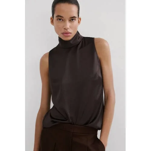 Geef je partylook een moderne update met deze Mango blouson top in donkerbruin. De top is gemaakt van zachte satijnstof met een subtiele glans, waardoor elke beweging licht opvangt. De rechte pasvorm valt losjes om je lichaam en de hoge hals geeft een rustige, geklede uitstraling. Ideaal voor speciale gelegenheden waarbij je net wat meer wilt uitpakken zonder dat het te druk wordt.Verfijnde details voor feestelijke momenten Satijnachtige stof met glanzende finish die mooi licht vangt Rechte snit die soepel langs het lichaam valt Hoge colkraag voor een moderne, elegante look Mouwloos model, fijn om laagjes mee te maken Verborgen ritssluiting aan de achterkant voor makkelijk aan- en uittrekken Effen donkerbruine kleur die mooi combineert met zowel lichte als donkere items Plooien bij de halslijn zorgen voor een subtiel volume-effect Onderdeel van de feest- en evenementencollectie van MangoVan diner tot dansvloerDeze blouson top leent zich goed voor avonden uit, etentjes en formele gelegenheden. Combineer met een hoge broek of een strakke rok en je outfit oogt direct netjes. Een blazer eroverheen maakt de look geschikt voor koelere lentedagen.Mango: eigentijdse mode met aandacht voor detailMango staat bekend om moderne collecties met een duidelijke modische signatuur. De ontwerpen spelen in op trends, maar blijven tegelijk draagbaar voor elke dag. Met deze top haal je een doordacht ontwerp in huis dat stijl en comfort samenbrengt.Een passende keuze voor momenten waarop je net wat meer wilt laten zien van je persoonlijke stijl.