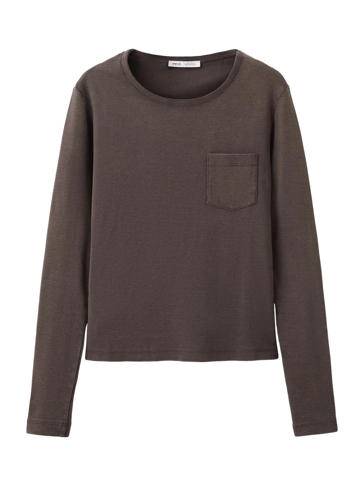 Dit bruine katoenen T-shirt met lange mouwen voor dames van Mango is een rustige basic voor elke dag. Het regular silhouet valt soepel om het lichaam en de ronde hals geeft een tijdloze, casual uitstraling. De opgestikte borstzak zorgt voor een subtiel detail, terwijl de effen kleur het T-shirt makkelijk combineerbaar maakt met je favoriete broeken, jeans en rokken. Gemaakt van 100% katoen voelt de stof zacht en luchtig aan, prettig voor dagen waarop je veel in beweging bent.Dagelijkse basic met doordachte details Gemaakt van 100% katoen voor een zachte en ademende stof Regular fit voor een ontspannen pasvorm die niet te strak zit Lange, rechte mouwen voor extra bedekking en comfort Ronde halslijn die mooi aansluit zonder te hoog te zijn Opgestikte borstzak als rustig detail op het effen ontwerp Bruine kleur die goed past bij de lente en makkelijk te stylen isVeelzijdig shirt voor elke dagDit T-shirt komt goed van pas in je dagelijkse garderobe. Draag het solo op een jeans voor een eenvoudige look of combineer het met een blazer voor net iets meer aangekleed. De lange mouwen maken het ideaal voor het voorjaar en koelere dagen.Mango: moderne stijl voor nuMango staat bekend om modieuze collecties met een toegankelijke uitstraling. De focus ligt op actuele trends gecombineerd met draagbare ontwerpen voor alledaagse momenten. Met dit T-shirt haal je een basisstuk in huis dat past binnen die moderne, verzorgde stijl.Een rustige essential die je makkelijk meeneemt in je dagelijkse outfits.