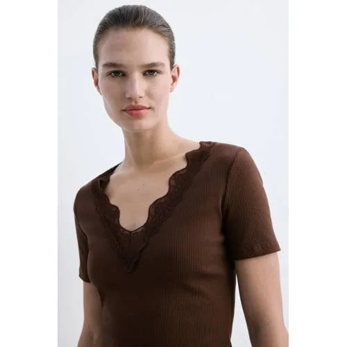 Dit bruin katoenen T-shirt voor dames van Mango is een basic met stijlvolle details. De katoenen stof voelt zacht en soepel aan, terwijl het getailleerde ontwerp je figuur subtiel volgt. De V-hals en korte mouwen geven een open, luchtige uitstraling, ideaal voor het voorjaar en voor alledaagse outfits. De kanten biesjes en lichte volantdetails zorgen voor een vrouwelijke touch, zonder dat het T-shirt te opvallend wordt.Fijne details voor elke dag Gemaakt van 91% katoen en 9% elastomeer voor een zachte stof met lichte stretch Getailleerd ontwerp dat mooi langs het lichaam valt Kanten biesjes en volantdetails voor een subtiel verfijnde look V-hals die de halslijn elegant laat uitkomen Korte, rechte mouwen voor een rustige en tijdloze uitstraling Effen bruine kleur die gemakkelijk te combineren is Zonder sluiting, zodat je het T-shirt eenvoudig aantrektMakkelijk te stylen in jouw garderobeDit T-shirt past goed bij je dagelijkse garderobe. Combineer het met een jeans en sneakers voor een relaxte dag, of draag het in een rok met laarsjes voor een wat gekledere look. De effen kleur maakt het eenvoudig om te combineren met andere items in jouw kast.Mango: moderne stijl voor elke dagMango staat bekend om moderne collecties die trends op een toegankelijke manier vertalen naar kleding voor elke dag. Met aandacht voor pasvorm en details biedt Mango mode die je eenvoudig kunt combineren tot een complete garderobe.Een veelzijdig T-shirt dat je het hele seizoen door kunt dragen.