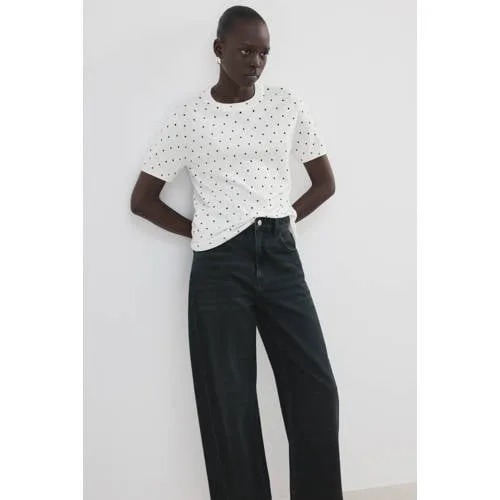 Voor een speelse maar rustige look is dit dames T-shirt met stippenprint van Mango een basic voor elke dag. Het fijngebreide materiaal valt soepel om het lichaam en de polka dot print in ecru / zwart geeft direct een grafisch accent. De ronde hals en korte mouwen zorgen voor een tijdloze uitstraling die je makkelijk combineert met je favoriete jeans, rok of pantalon.Details die je elke dag aantrekt Fijn breisel met zachte touch voor een comfortabel gevoel op de huid Recht ontwerp dat ontspannen valt, zonder te strak te zitten Polka dot print in ecru / zwart voor een grafische look Ronde hals en korte, rechte mouwen voor een rustige basis Contrasterende ribbels langs hals en boorden voor een nette afwerking Zonder sluiting, zodat je het T-shirt eenvoudig aantrekt Gemaakt van 50% katoen / 50% viscose voor een soepele en lichte kwaliteit Onderdeel van de Daily collectie, geschikt voor dagelijks dragen Beschikbaar in standaardmaten en als Plus, zodat je dezelfde stijl in meer maten vindtVoor alledaagse combinatiesDit T-shirt past bij veel momenten, van werk tot weekend. Draag het op een mom jeans met sneakers voor een casual look of combineer met een zwarte pantalon voor een meer geklede uitstraling. De neutrale kleuren maken het eenvoudig om te stylen met wat al in je kast hangt.Mango: eigentijdse mode voor elke dagMango staat bekend om moderne collecties met heldere lijnen en herkenbare prints. De focus ligt op draagbare stijlen die je gemakkelijk mix en matcht. Met dit T-shirt kies je voor een eigentijds ontwerp dat goed aansluit bij een garderobe waarin comfort en stijl samenkomen.Een basisstuk dat je vaak uit de kast zult pakken.