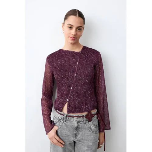 Deze MANGO TEEN blouse voor meisjes combineert een moderne pasvorm met speelse details. De paarse all over print valt direct op en de vloeiende, semi-transparante stof geeft een lichte, luchtige uitstraling. Door het asymmetrische ontwerp en de V-hals krijgt de blouse een eigentijdse look die goed past bij zowel een jeans als een rok.Opvallende details in paarse print Asymmetrisch ontwerp voor een moderne uitstraling Wijd uitlopende flare mouwen voor extra effect bij elke beweging Detail van decoratieve knopen aan de voorkant V-hals die mooi aansluit bij verschillende halskettingen All over print in paarse tinten voor een speels geheel Gemaakt van 99% polyester en één procent metaalgaren, met voering van 100% polyester Semi-transparante bovenlaag met gladde voering voor extra draagcomfort Zonder zakken voor een rustig en licht silhouetEen blouse voor zowel doordeweeks als feestelijkDeze blouse is geschikt voor allerlei momenten. Combineer met een effen broek of rok zodat de print goed uitkomt, of draag er een aansluitende jeans onder voor een meer casual outfit. Door de lange mouwen is de blouse ook fijn op koelere dagen, met eventueel een vest of jasje eroverheen.MANGO TEEN: mode voor jonge stijlliefhebbersMANGO TEEN richt zich op kleding waarin jonge meisjes zich vrij kunnen bewegen, maar wel met een modieuze uitstraling. De ontwerpen volgen de laatste trends en vertalen die naar draagbare items voor elke dag. Zo ontstaat een garderobe die eenvoudig te combineren is en lang mee kan.Een licht vallende blouse die elke outfit direct meer karakter geeft.