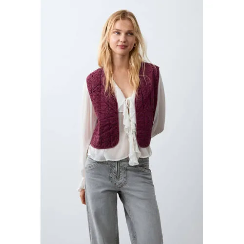 Geef elke outfit meer karakter met dit MANGO TEEN gilet voor meisjes in donkerrood. De gewatteerde stof en rechte pasvorm zorgen voor een moderne look, terwijl de subtiele bloemenborduursels het ontwerp een speelse en verzorgde uitstraling geven. Het mouwloze model met V-hals is eenvoudig aan en uit te trekken en past moeiteloos over T-shirts, blouses en jurken.Details die het verschil maken Gewatteerde stof voor een licht gevuld en comfortabel gevoel Rechte pasvorm die soepel over de kleding valt Bloemenborduursel als sierlijk detail op de effen basis V-hals en mouwloos ontwerp, ideaal om te layeren Zonder sluiting aan de voorkant voor een open, casual look Gemaakt van 100% katoen met katoenen voering, voelt zacht aan op de huid Geen zakken voor een rustige, strakke uitstralingLaagje voor schooldag of weekendDit gilet is een extra laagje op frissere dagen. Over een longsleeve of dun truitje geeft het wat extra warmte zonder te dik aan te voelen. Door de donkerrode kleur combineert het makkelijk met denim, neutrale tinten of zachte pastels.MANGO TEEN: eigentijds en toegankelijkMANGO TEEN richt zich op kleding die meegaat met trends en toch praktisch blijft voor elke dag. Met aandacht voor draagcomfort, materialen en doordachte details biedt het merk mode die past bij het actieve leven van meiden.Een veelzijdig gilet voor alledaagse momenten.