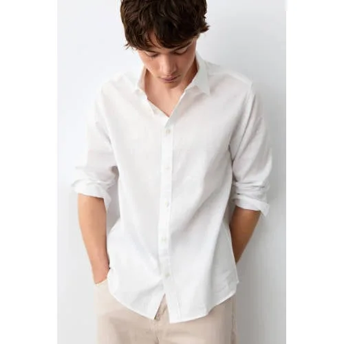 Voor zomerse dagen en frisse looks is dit wit linnen-katoen overhemd voor jongens van MANGO TEEN een fijne basic voor elke tienergarderobe. De mix van 55% linnen en 45% katoen zorgt voor een luchtig en soepel gevoel, terwijl de rechte, loose pasvorm genoeg ruimte geeft om vrij te bewegen. De effen witte kleur maakt het overhemd makkelijk te combineren, van schooldag tot familie-etentje.Praktische details voor elke dag Gemaakt van 55% linnen en 45% katoen voor een luchtige, comfortabele feel Rechte, losse pasvorm voor een ontspannen silhouet en veel bewegingsvrijheid Klassieke overhemdkraag voor een nette, maar toch casual uitstraling Lange mouwen met knoopmanchetten, handig om op te rollen als het warmer wordt Knoopsluiting over de hele voorkant, makkelijk aan en uit te trekken Effen witte kleur, goed te combineren met jeans, chino's of korte broeken Speciaal ontworpen voor tieners, sluit goed aan bij een groeiende kindergarderobeCasual of netjes, net wat hij nodig heeftVoor een ontspannen schooldag combineer je dit overhemd met een korte broek en sneakers. Moet het netter, dan staat het mooi op een donkere jeans of chino, eventueel over een T-shirt open gedragen. De witte kleur past bij veel stijlen, zodat het overhemd vaak uit de kast gepakt kan worden.MANGO TEEN: ontworpen met tieners in gedachtenMANGO TEEN richt zich op moderne tieners die graag kleding dragen die comfortabel zit en goed aansluit bij hun eigen stijl. De collecties volgen de trends, maar blijven tegelijkertijd draagbaar voor alledag. Met dit overhemd kies je voor een doordacht ontwerp dat aansluit bij het dagelijks leven van een tiener.Een lichte, veelzijdige basic waar hij het hele seizoen iets aan heeft.