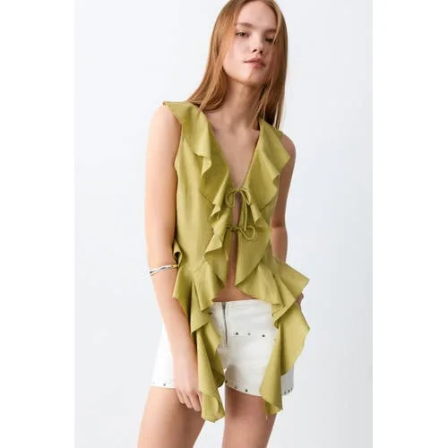 Deze groene katoenen mouwloze meisjes top van MANGO TEEN is een lichte, luchtige basic met speelse details. De top is gemaakt van 100% katoen en voelt soepel aan op de huid, ideaal voor warme dagen of als laagje onder een vest. De V-hals met striksluiting en ruches geven de top een eigen uitstraling ten opzichte van een gewone hemdtop.Frisse groene top met sierlijke details Gemaakt van 100% katoen, prettig ademend en zacht om te dragen V-hals met strikdetail bij de halslijn voor een verzorgd detail Mouwloos model, handig op warme dagen of onder een jasje Ruches langs de halslijn zorgen voor een speels effect Rechtvallende pasvorm, comfortabel en niet te strak Effen groene kleur, makkelijk te combineren met jeans, shorts of een rokGemakkelijk te stylen voor school en vrije tijdDeze top past goed bij de dagelijkse garderobe van tienermeiden. Combineer met een korte jeansshort en sneakers voor een casual zomeroutfit, of draag de top met een wijde broek en sandalen voor een meer aangeklede look. Door het mouwloze model kan er eenvoudig een vest of spijkerjack overheen als het frisser wordt.MANGO TEEN: stijl voor tienermeidenMANGO TEEN ontwerpt kleding speciaal voor tieners, met aandacht voor actuele trends en draagbare modellen. De collecties sluiten aan bij wat meiden graag dragen in hun dagelijks leven, met comfortabele materialen en moderne pasvormen. Zo ontstaat een garderobe met een nette uitstraling en prettig draagcomfort.Een groene zomertop die vaak gedragen kan worden tijdens warme dagen.