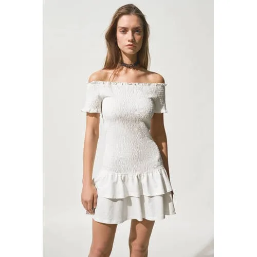 Deze off shoulder meisjes jurk van MANGO TEEN is een lichte, zomerse basic voor tieners die houden van een frisse, natuurlijke look. De jurk is gemaakt van 100% katoen in een zachte naturel witte kleur, wat zorgt voor een soepele stof die prettig aanvoelt op de huid. De strapless halslijn met off shoulder effect en korte mouwen geven een luchtige uitstraling, ideaal voor warme dagen.Details die het verschil maken Gemaakt van 100% katoen voor een ademend en zacht draaggevoel Off shoulder halslijn met korte mouwen voor een luchtige look Gerimpelde details en smockwerk voor een aansluitende pasvorm aan de bovenkant Ruche aan de onderkant voor een speelse afwerking Mini jurk lengte, geschikt voor de tienermaatboog Zonder sluiting, de jurk wordt eenvoudig over het hoofd aangetrokken Effen dessin in naturel wit dat rustig oogt en makkelijk te combineren is Geen zakken voor een gladde, vrouwelijke vormLuchtige jurk voor zomerse momentenDe jurk is geschikt voor alledaagse momenten, maar past ook goed bij een etentje of een feestje. Door de aansluitende bovenkant en het iets uitlopende rokje blijft het model comfortabel, terwijl de ruches en rimpels zorgen voor een verzorgde uitstraling.MANGO TEEN: stijl voor tienersMANGO TEEN is de tienercollectie van MANGO, ontwikkeld met aandacht voor actuele trends en draagbare modellen. De pasvormen zijn afgestemd op groeiende lichamen, zodat tieners zich vrij kunnen bewegen en er tegelijk verzorgd uitzien.Een lichte, makkelijk te dragen jurk die elke zomerse dag net wat specialer maakt.