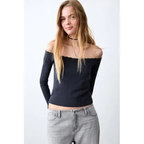 MANGO TEEN off shoulder top marineblauw broderie