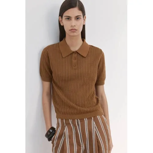 Deze Mango gebreide top van katoen is een rustige basic met subtiele details voor elke dag. De top is gemaakt van 100% katoen en voelt zacht en luchtig aan op de huid. De fijngebreide ajourstof en het ingebreide patroon geven het rechte ontwerp net wat extra karakter. In combinatie met de polokraag en korte mouwen ontstaat een aangesloten model dat mooi aansluit zonder te strak te zitten.Verfijnde details voor iedere dag Gemaakt van 100% katoen, voor een zachte en ademende touch Fijngebreide ajourstof met subtiel ingebreid patroon Aangesloten pasvorm met rechte mouwen voor een nette look Polokraag met voorsluiting en drie knopen Bruine effen kleur, gemakkelijk te combineren Geribde boorden die de vorm mooi laten aansluiten Geen zakken, voor een rustig en strak vooraanzichtEen top voor jouw dagelijkse momentenDeze bruine gebreide top past goed in je dagelijkse garderobe. Draag de top in het voorjaar op een lichte jeans of een chino, of combineer met een rok voor een iets gekledere uitstraling. De korte mouw en ademende stof maken het een geschikte optie voor mildere dagen.Mango: modieuze basics met een eigentijdse twistMango staat bekend om moderne collecties die trends op een toegankelijke manier vertalen naar draagbare items. Met aandacht voor pasvorm en details biedt Mango kleding die geschikt is voor alledaagse momenten, maar ook voor iets specialere gelegenheden.Een veelzijdige gebreide top die moeiteloos meebeweegt met jouw dag.
