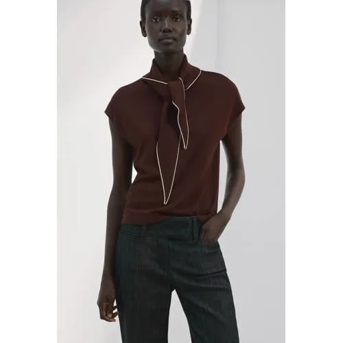 Deze Mango top is een fijne basic met een moderne twist. De top is gemaakt van een zachte gebreide stof en heeft een recht ontwerp dat soepel langs het lichaam valt. De effen kleur maakt het een veelzijdig item, terwijl het sjaaltje om de hals direct zorgt voor een verzorgde, aangeklede look. De korte mouw en luchtige materiaalcombinatie maken deze top geschikt voor zowel werk als vrije tijd.Comfortabele details in een strak ontwerp Zachte gebreide kwaliteit met een gladde, comfortabele touch Recht silhouet dat niet aftekent en prettig valt Sjaalkraag met vast sjaaltje om de hals voor een elegante afwerking Korte, rechte mouwen voor een rustige en tijdloze uitstraling Effen uitvoering, eenvoudig te combineren met broeken en rokken Verkrijgbaar in Plus, zodat dezelfde stijl ook in grotere maten te kiezen is Hoofdmateriaal: 83% viscose en 17% polyamide, kraag: 58% viscose en 42% polyamide Zonder zakken, wat zorgt voor een strakke en nette lookIdeaal voor werk, weekend en alles daartussenDeze top past net zo goed op een nette pantalon als op een relaxte jeans. Het sjaaltje om de hals geeft meteen structuur aan je outfit, waardoor je met weinig moeite verzorgd voor de dag komt.Stijl volgens MangoMango staat bekend om eigentijdse collecties waarin comfort en stijl samenkomen. De ontwerpen sluiten aan op het dagelijks leven, met aandacht voor pasvorm, draaggemak en een moderne uitstraling die lang mee kan.Een toegankelijke knit die je garderobe rustig, stijlvol en compleet maakt.