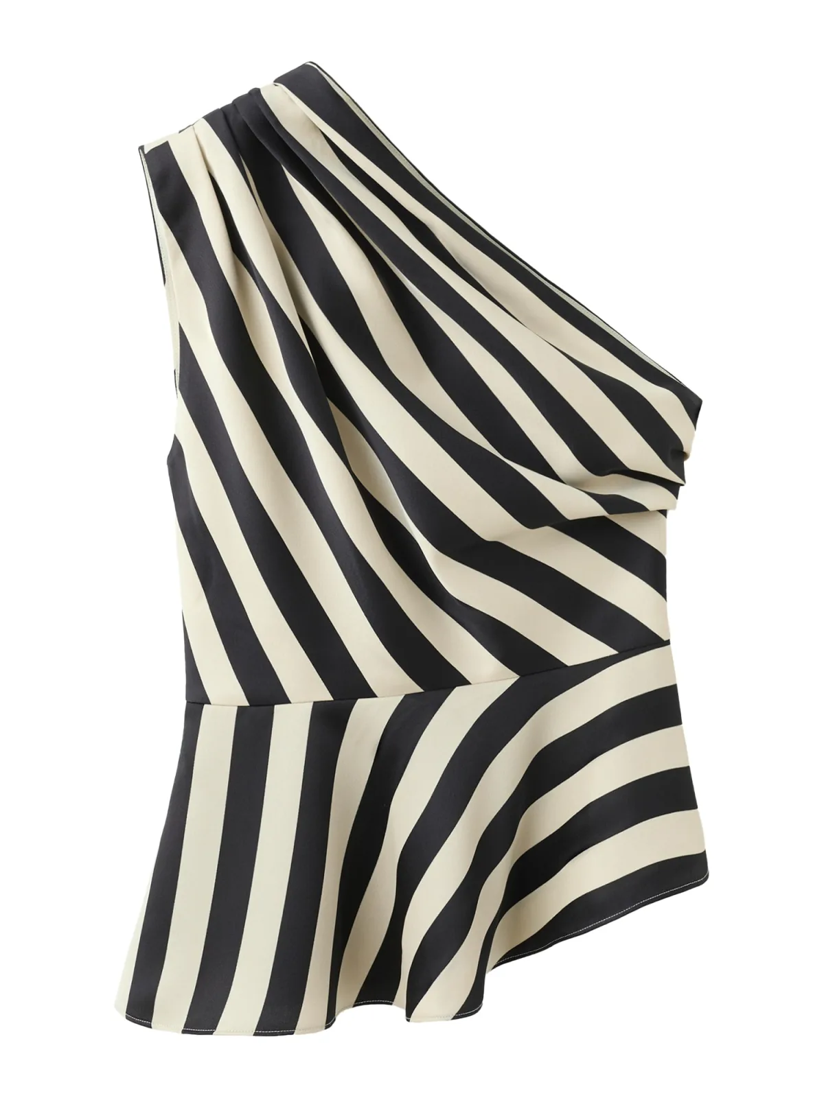 Geef je partylook een moderne twist met deze asymmetrische one shoulder top van Mango. De top heeft een rechte snit en valt soepel om het lichaam dankzij de subtiele peplum onderaan. De zwart/beige strepen zorgen voor een helder lijnenspel dat meteen opvalt, zonder schreeuwerig te zijn. Ideaal voor avonden uit, een bruiloft of een ander speciaal moment.Details die je silhouet versterken Asymmetrisch ontwerp met one shoulder, voor een moderne, open schouderlijn Mouwloos model, prettig luchtig op warme zomerdagen en avonden Zwart/beige streeppatroon dat het bovenlichaam duidelijk accentueert Gesmokt detail op de schouder voor een licht geplooid effect Peplum detail langs de onderkant voor een subtiele taille benadrukking Zijritssluiting zodat de top makkelijk aan en uit te trekken is Gemaakt van een gladde, soepele stof die mooi langs het lichaam valt Onderdeel van de feest- en evenementencollectie van MangoPerfect voor speciale gelegenhedenDeze top komt het mooist tot zijn recht op momenten waarop je net wat meer aandacht aan je outfit wilt geven. Combineer met een hoge pantalon of een strakke rok en een paar hakken, en je hebt in één keer een complete look voor een zomerfeest, diner of event.Mango: eigentijdse stijlMango biedt collecties met een eigentijdse uitstraling. De ontwerpen volgen de trends en blijven goed draagbaar voor alledaagse en bijzondere momenten. Met deze top voeg je een feestelijk item toe aan je garderobe waar je veel combinaties mee kunt maken.Een passende keuze als je een lichte, stijlvolle top zoekt voor je volgende speciale gelegenheid.