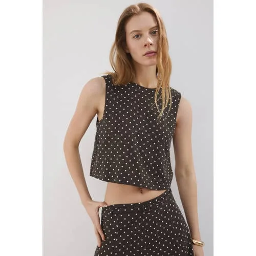 Deze linnen top met polkadotprint van Mango is een lichte, zomerse basic die er toch verzorgd uitziet. De linnenmix stof met viscose voelt luchtig aan op de huid en heeft een subtiele, natuurlijke structuur. De donkerbruine en ecru tinten zorgen samen voor een rustige, moderne look die je makkelijk combineert met je bestaande garderobe.Details die het verschil maken Gemaakt van 55% linnen en 45% viscose voor een ademend en soepel draaggevoel Cropdesign dat mooi valt op een hoge taille broek of rok Polka dot print in donkerbruin / ecru voor een speels maar rustig beeld Ronde hals en rechte pasvorm voor een tijdloze, eenvoudige look Mouwloos met brede bandjes voor fijne bedekking rond de schouders Knopensluiting op de schouder, handig bij het aan- en uittrekken en een leuk detail van opzij Geen zakken voor een strak, verzorgd silhouetIdeaal voor zonnige dagenDeze top komt goed tot zijn recht in de lente en zomer. Combineer met een linnen broek voor een total look, of draag de top op een denim short en sandalen. Door het cropped model past de top mooi bij kledingstukken met een hoge taille.Mango: eigentijdse stijl voor elke dagMango staat bekend om modieuze collecties met een heldere, vrouwelijke stijl. De ontwerpen volgen de trends, maar blijven tegelijk draagbaar in het dagelijks leven. Met deze top kies je voor een item dat past binnen een moderne garderobe, met aandacht voor kleur, pasvorm en draagcomfort.Een luchtige aanvulling voor warme dagen waarop je er verzorgd uit wilt zien zonder moeite.