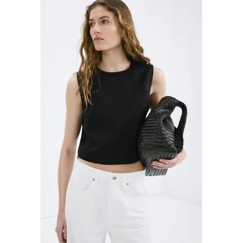 Deze zwarte linnen dames top van Mango is een luchtige basis voor warme dagen. Het rechte, korte ontwerp valt net boven de taille, waardoor het mooi aansluit op hoge broeken en rokken. De subtiele boothals en mouwloze pasvorm geven een open, lichte uitstraling die prettig is in het voorjaar en de zomer. Gemaakt van 100% linnen voelt de stof koel en soepel aan op de huid.Verfijnde details in een eenvoudige look Gemaakt van 100% linnen, een luchtig materiaal dat prettig draagt bij hogere temperaturen Cropdesign dat goed combineert met high waist jeans, shorts en rokken Recht model voor een ontspannen silhouet Mouwloos ontwerp voor extra bewegingsvrijheid Druppelvormige uitsnede met sluiting aan de achterkant voor makkelijk aan- en uittrekken Knoopdetail aan de zijkant als subtiel accent Effen zwarte kleur, eenvoudig te stylen binnen je dagelijkse garderobeVoor dagelijkse outfits in het voorjaarDeze top komt uit de daily collectie en is ontworpen voor alledaags draaggemak. Combineer met een wijde linnen broek voor een luchtige set op warme dagen, of draag hem met een denim rok en sandalen voor een casual look. Door de korte lengte blijft je taille duidelijk zichtbaar, wat zorgt voor een moderne uitstraling.Mango: moderne mode voor elke dagMango staat bekend om toegankelijke mode met een moderne en tijdloze insteek. De collecties spelen in op actuele trends, maar blijven tegelijk geschikt voor dagelijks gebruik. Met deze top haal je een stijlvolle basic in huis die past binnen een garderobe waarin comfort en een verzorgd uiterlijk samenkomen.Een lichte, zwarte top die het hele seizoen door een vaste plek in je kledingkast kan innemen.