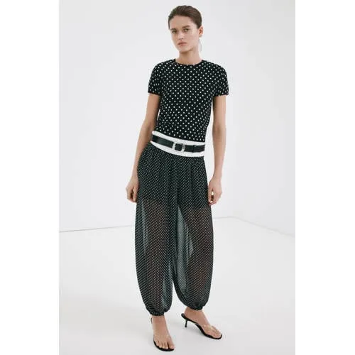 Voor een frisse, dagelijkse look is deze katoenen dames top met stippen een praktische keuze. Het rechtvallende maar subtiel getailleerde ontwerp volgt je figuur op een natuurlijke manier. De zwarte basis met ecru stippen zorgt voor een rustig dessin dat makkelijk te combineren is. De fijne gebreide stof voelt soepel aan en de ronde hals en korte mouwen maken deze top passend voor het voorjaar en milde dagen.Details die het verschil maken Gemaakt van 50% katoen en 50% viscose voor een zachte, soepele touch Fijn breisel dat comfortabel aanvoelt op de huid Recht ontwerp met lichte taillering voor een vrouwelijke pasvorm Zwart met ecru stippen voor een subtiele print Ronde hals en korte mouw, geschikt voor het lente seizoen Geen zakken voor een rustige, clean uitstralingVeelzijdig in je dagelijkse garderobeDeze top laat zich makkelijk combineren in je dagelijkse garderobe. Draag met een zwarte pantalon voor een werkdag of met een lichte jeans voor een meer casual outfit. Door het compacte breisel valt de top netjes en blijft de stippenprint duidelijk zichtbaar.Mango: eigentijdse stijlMango brengt collecties met moderne mode en aandacht voor detail en pasvorm. De ontwerpen sluiten aan bij actuele trends en zijn geschikt voor elke dag. Met deze top voeg je een stijlvol basisitem toe aan je kast dat je op verschillende manieren kunt dragen.Een comfortabele keuze als je op zoek bent naar een draagbare top voor alledaags gebruik.