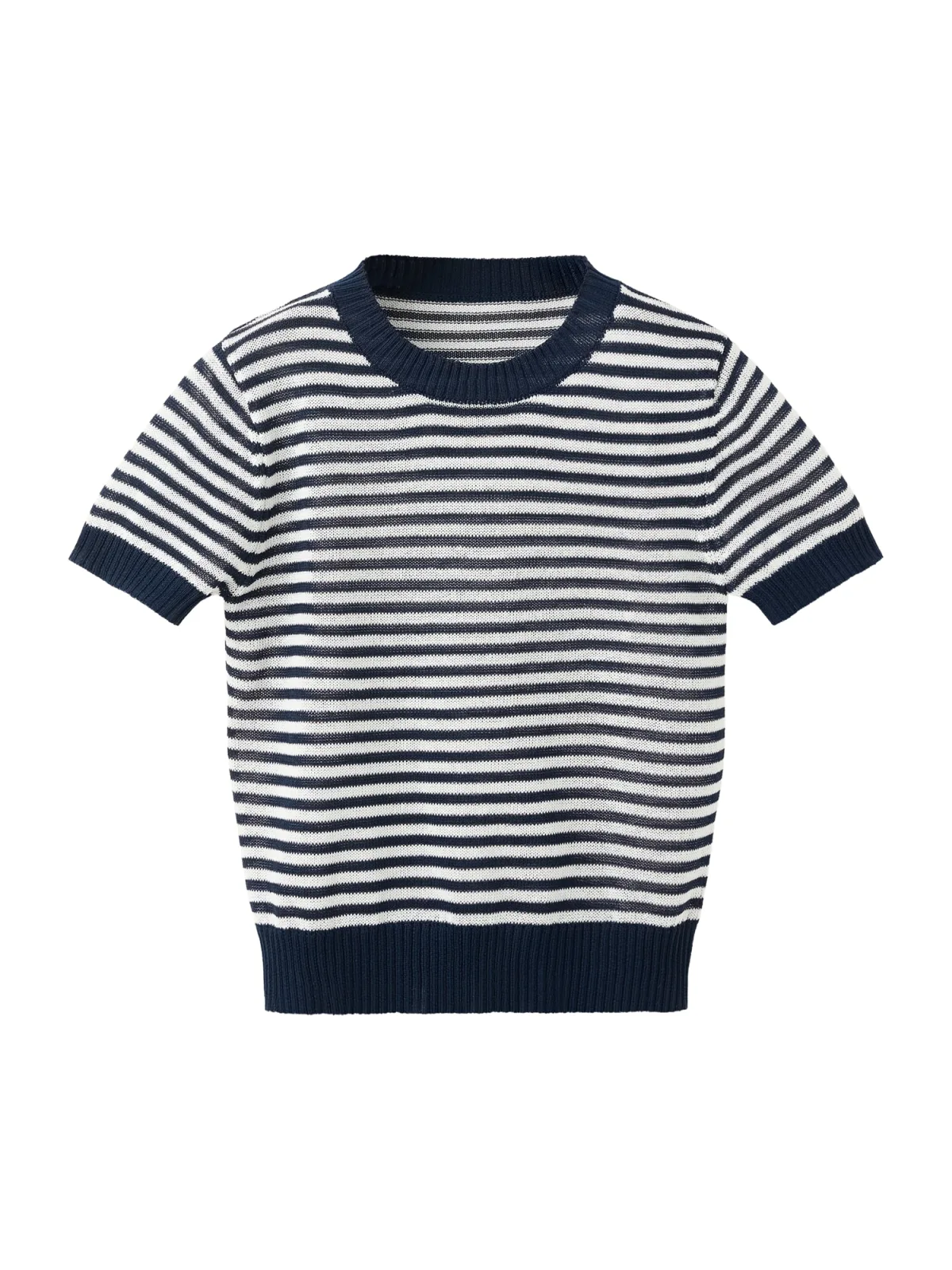 Deze gestreepte top met korte mouw voor dames van Mango is een lichte basic voor elke dag. De marinekleurige strepen geven een rustige, tijdloze look en het iets bredere ontwerp valt soepel om je lichaam. De ronde hals en rechte mouwen zorgen voor een eenvoudige uitstraling die gemakkelijk te combineren is met je favoriete items.Details die het verschil maken Marinekleurige streepprint voor een frisse, casual uitstraling Breed ontwerp dat losjes valt voor een ontspannen pasvorm Ronde hals die mooi aansluit zonder te hoog te zitten Korte, rechte mouwen die je armen vrij laten Bandsluiting met elastiek aan de onderkant voor een nette, blousende look Stof met linnen, waardoor de top licht en luchtig aanvoelt Onderdeel van de Daily collectie, ideaal voor alledaags gebruik in het voorjaarGemakkelijk te stylen in het dagelijks levenDeze top past goed bij een rechte jeans, een lichte chino of een korte broek op warmere dagen. Door de elastische band blijft de zoom netjes op zijn plek, ook wanneer je de top op een taillebroek draagt. De streepprint maakt accessoires in effen kleuren extra duidelijk en rustig.Mango: modern en toegankelijkMango staat bekend om mode die de trends volgt en toch draagbaar blijft in het dagelijks leven. De collecties combineren heldere lijnen met doordachte details, waardoor je eenvoudig outfits samenstelt die lang actueel blijven.Een veelzijdige, luchtige top die je garderobe klaar maakt voor het nieuwe seizoen.
