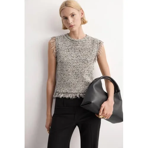 Geef je dagelijkse look een stijlvolle update met deze Mango dames top van tweed. De top heeft een recht model en een ronde hals, waardoor de stof mooi langs het lichaam valt zonder strak te zitten. De zwarte tweed met subtiele structuur geeft direct een verzorgde uitstraling, terwijl de gerafelde randen langs hals, armsgaten en zoom zorgen voor een speels detail. De top is mouwloos en heeft geen sluiting, deze trek je dus eenvoudig over je hoofd aan.Tweed top met speelse franjes Zwarte tweed stof met voelbare structuur voor een verfijnde look Rechte snit die comfortabel valt en makkelijk te combineren is Ronde hals en mouwloos ontwerp, ideaal voor warme dagen of onder een blazer Gerafelde afwerking langs hals, armsgaten en taille voor een moderne twist Zonder sluiting, je trekt de top snel en makkelijk aan Bevat katoen voor een zachte touch op de huidVeelzijdig voor werk en vrije tijdDeze top past goed bij een rechte pantalon of een jeans met hoge taille. Voor naar kantoor combineer je hem met een blazer, voor een etentje draag je hem op een zwarte rok. Door de effen kleur is het eenvoudig om sieraden of een opvallende tas toe te voegen.Mango: moderne stijl voor elke dagMango staat bekend om modieuze items die aansluiten op de trends van het seizoen en toch goed draagbaar blijven in het dagelijks leven. De collecties combineren heldere lijnen met doordachte details, zodat je met weinig moeite een complete outfit samenstelt die verzorgd oogt.Een moderne top die je garderobe net dat beetje extra geeft.