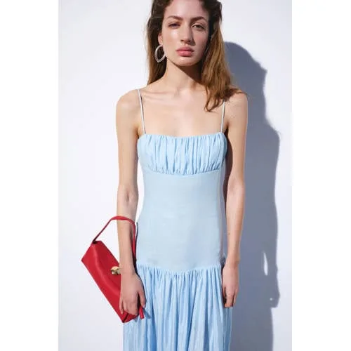 Deze lichtblauwe midi jurk van Mango uit de Selection collectie voegt een frisse optie toe aan je zomergarderobe. Het lange, licht uitlopende A-lijn ontwerp valt soepel langs het lichaam en laat de taille subtiel spreken. De geplooide details zorgen voor extra beweging in de stof, terwijl de rechte, vierkante halslijn en de fijne schouderbandjes voor een moderne uitstraling zorgen. Dankzij de binnenvoering tekent de stof niet af en blijft de pasvorm mooi in vorm, ook tijdens een lange dag of avond.Verfijnde details voor een zomerse look Lichtblauwe kleur die fris oogt en mooi combineert met neutrale accessoires Lang A-lijn ontwerp dat soepel meebeweegt bij elke stap Geplooid ontwerp voor extra textuur en een elegante valling Recht decolleté met vierkante hals voor een moderne, open halslijn Mouwloos model met fijne bandjes, ideaal voor warme zomerdagen Verborgen ritssluiting aan de achterkant voor een strakke, nette afwerking Gevoerde body die comfortabel aanvoelt en extra draaggemak geeft Linnen schouderbandjes voor een luchtige touchGeschikt voor feestelijke momentenDeze midi zomerjurk is een praktische keuze als je iets zoekt dat zowel feestelijk als eenvoudig te dragen is. Voor een bruiloft of ander speciaal moment combineer je de jurk met sandalen met hak en een kleine clutch. Met platte sandalen en een lichte shawl draag je dezelfde jurk weer gemakkelijk naar een zomerse lunch of een etentje op vakantie.Mango: eigentijdse mode voor elke dagMango staat bekend om collecties die trends vertalen naar draagbare kleding voor elke dag. De ontwerpen hebben een moderne uitstraling, met aandacht voor vorm, kleur en detail. Daardoor sluit een jurk als deze Selection goed aan bij verschillende gelegenheden, zodat je hem vaak uit de kast pakt.Een frisse keuze voor zomerse dagen en feestelijke avonden.