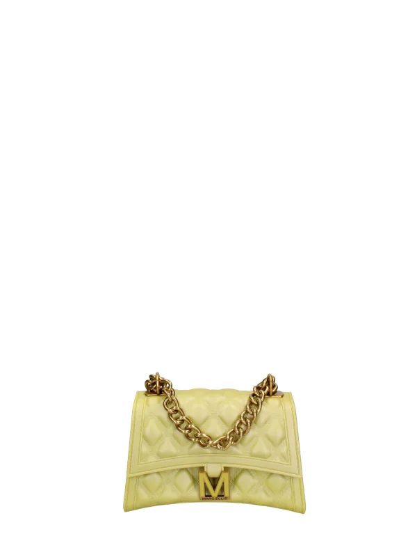 Dameshandtas met kliksluiting. ontbrekende binnenzakken. afwezige externe zakken. verstelbare en afneembare schouderband. ketting handvat. een binnencompartiment. extern materiaal. 100% rubberen binnenkant. Afmetingen: 12,5x19,5x8 cm. Modeproduct