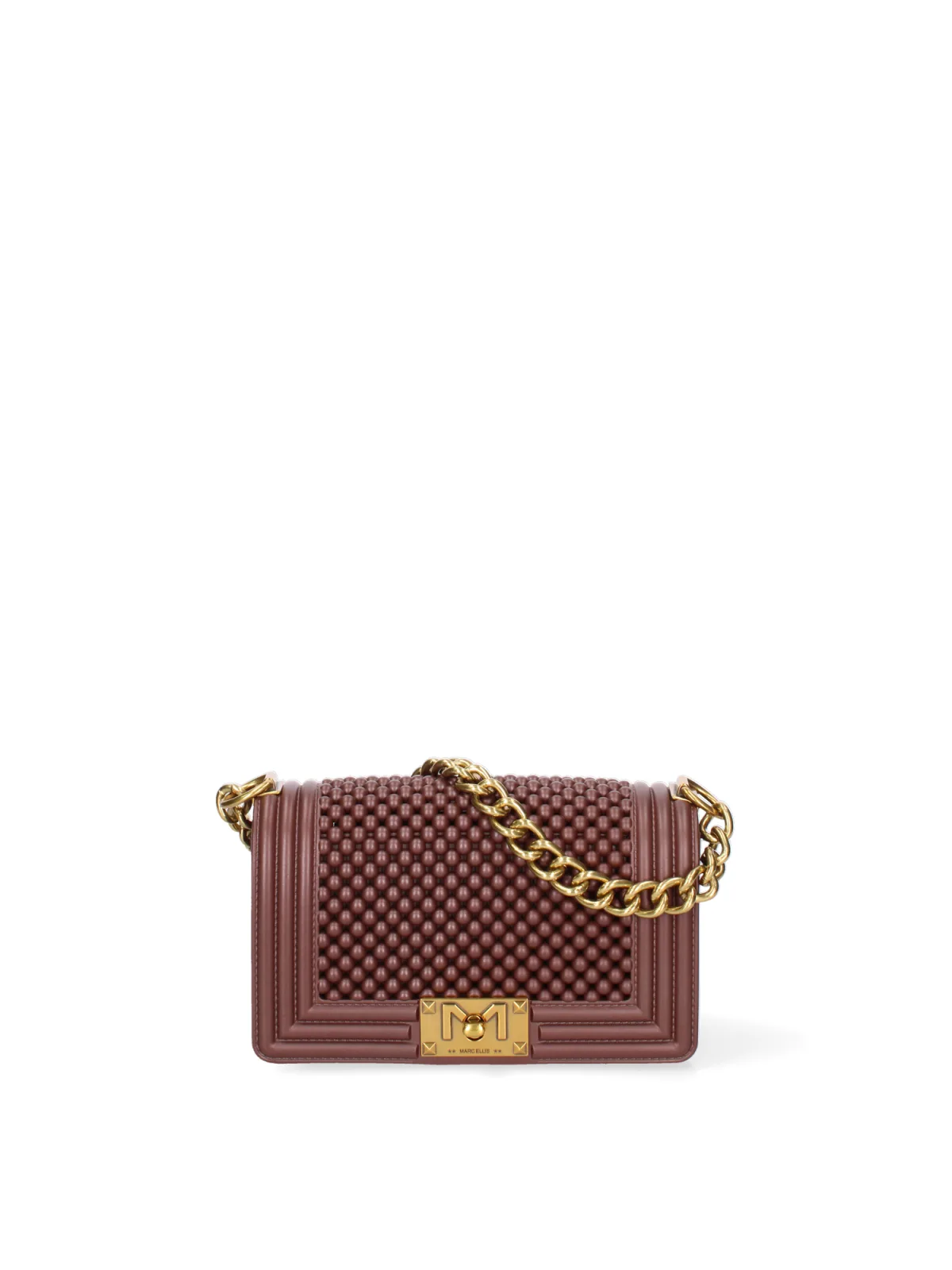 Dameshandtas met rollatorsluiting. ontbrekende binnenzakken. afwezige externe zakken. verstelbaar en afneembaar in stoffen schouderband. ketting handvat. een binnencompartiment. extern materiaal. PVC interieur. Afmetingen: 11x19x6,5 cm. Modeproduct