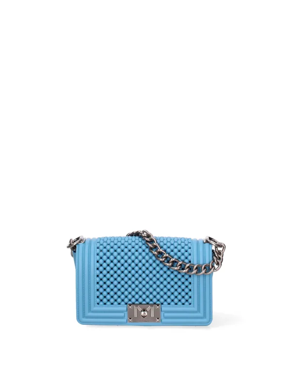 Dameshandtas met rollatorsluiting. ontbrekende binnenzakken. afwezige externe zakken. verstelbaar en afneembaar in stoffen schouderband. ketting handvat. een binnencompartiment. extern materiaal. PVC interieur. Afmetingen: 11x19x6,5 cm. Modeproduct
