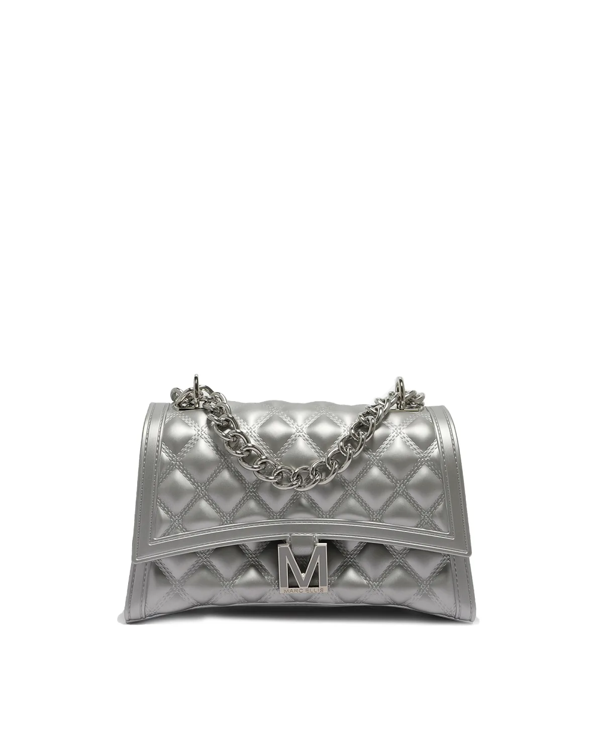 Dameshandtas In elkaar grijpende sluiting. ontbrekende binnenzakken. afwezige externe zakken. ketting schouderband. ontbrekend handvat. één binnenvakken. HandtasDames extern materiaalPVC binnenkant. Afmetingen: 25x15x8 cm. Modeproduct