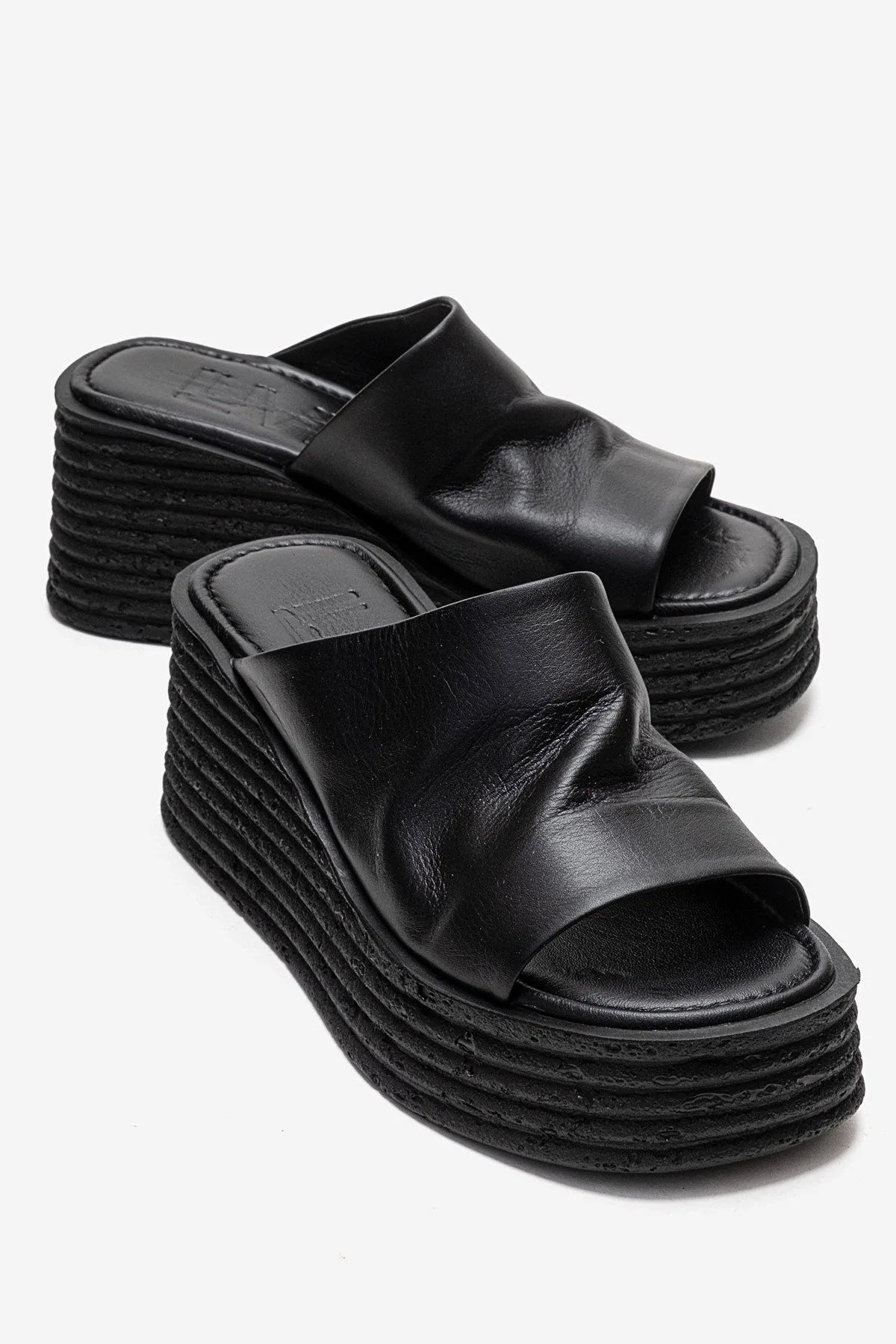 Een minimalistische plateau-slide van 100% echt leer met een gedurfd silhouet, verfijnd vakmanschap en comfort voor de hele dag