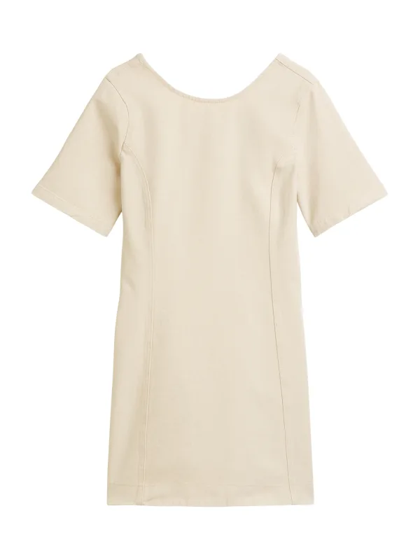 Design: Gevoerde zoom/rand, Rechte zoom, Deelnaden, Uitgesneden rug; Materiaal: Denim; Halstype: Ronde hals; Motief: Effen; Extra's: Op staal naden, Vaste grip; Lengte: Kort/mini; Pasvorm: Losse pasvorm; Armlengte: Halve mouw