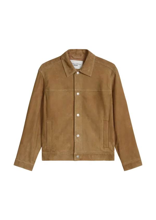 Heren leren jack van Marc O'Polo Denim;Look: effen;Pasvorm: Regular Fit;Kraagmodel: Platte kraag;Sluiting: Drukknopen;Details: Achterpas;Mouwvorm: lange mouw;Mouwboord: Manchet;Zakken: zij-steekzakken;Materiaalverwerking: Velours;Materiaal: echt geitenleer