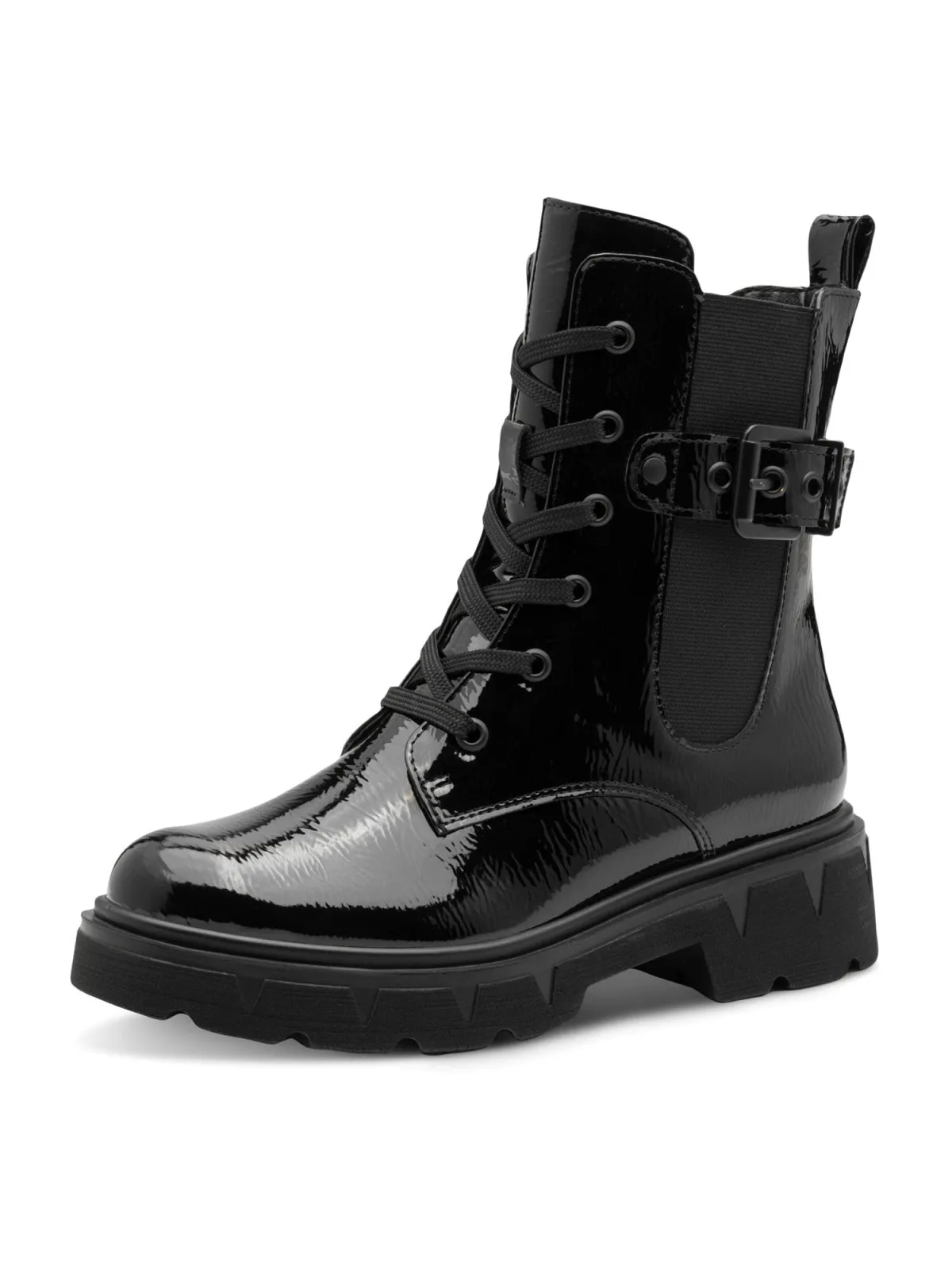Design: Vetering met 6 gaten, Elastische inzetstukken, Profielzolen, Versterkte hak, Hielband; Type sluiting: Snoersluiting; Type hak: Blokhak; Motief: Effen; Materiaal: Imitatieleer; Schoenneus: Spitse neus; Extra’s: Glanzend, Gladde stof, Metalen oogjes; Hakhoogte: Platte hak (0-3 cm)