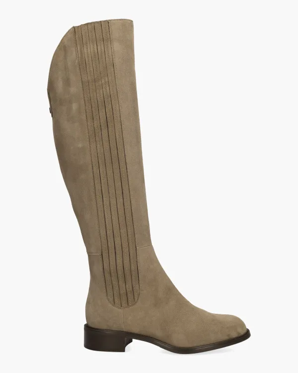 Deze taupe damesboots van Nalini model 24I201 combineren een elegante uitstraling met draagcomfort. Het zachte suède en de rechte, circa 47 cm hoge schacht geven de laars een slanke, tijdloze vorm. Aan de buitenzijde zorgt een elastisch paneel met verticale stiksels voor een verfijnd detail én een verlengend effect. De lage hak van 3 cm