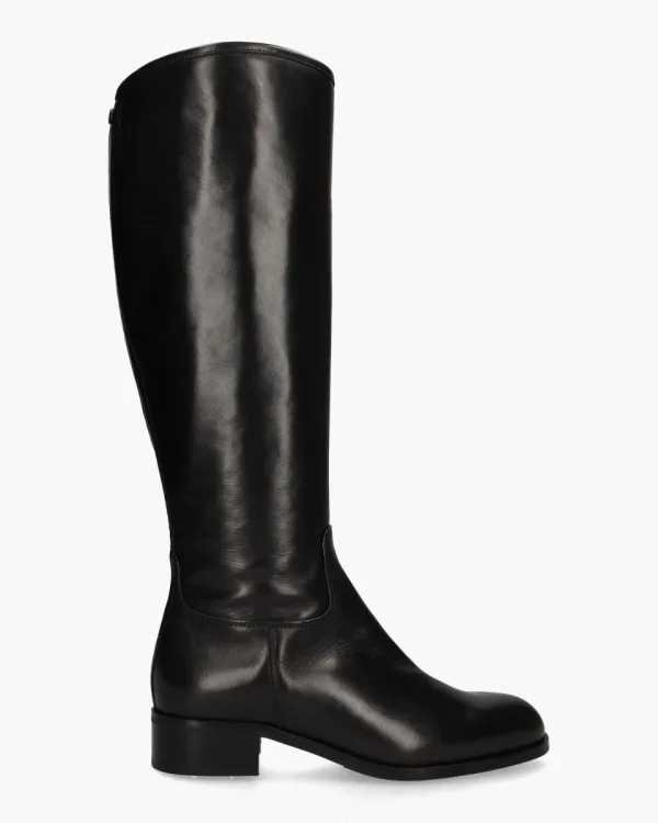 Lange boots voor dames 454A van het Italiaanse merk Nalini. Deze laarzen op een smallere XS-leest hebben een bovenzijde van glad en stevig zwart leer. De binnenkant is ook in leer uitgevoerd en voorzien van een vast voetbed. De leest is rond. De schacht heeft een hoogte van circa 39 cm en heeft over de gehele lengte een rits. De lage