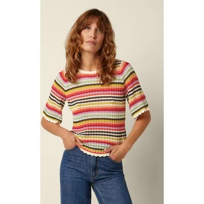 “Color your day, stripe by stripe.” Deze Maree Basile top heeft een hoge, ronde halslijn en 1/2 wijd uitlopende mouwen, afgewerkt met speels geschulpte biesjes. Het opengewerkte zigzagpatroon en het kleurrijke streeppatroon geven haar een vrolijke, retro feel. Ze is uitgevoerd in soepele en stretchy 100% biologisch katoen, waardoor ze heerlijk comfortabel draagt. * Ronde halslijn * 1/2 wijd uitlopende mouwen * Stretchy ribboord * Lang genoeg om op een normale heupbroek te dragen