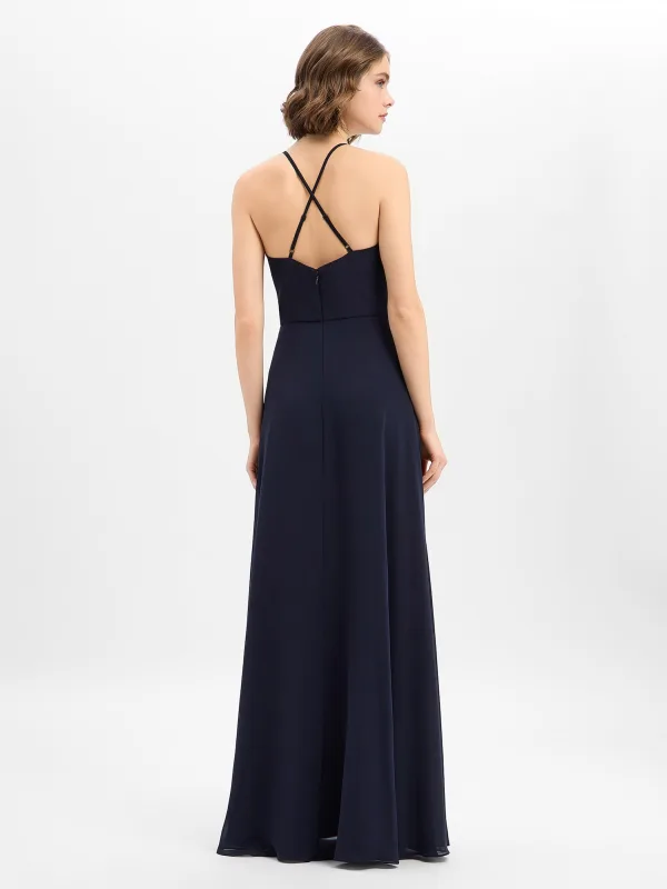 Design: A-lijn; Type sluiting: Ritssluiting; Materiaal: Chiffon; Motief: Effen; Soort bandjes: Spaghettibandjes; Details: Plooien; Extra's: Op staal naden; Lengte: Lang/maxi; Snit: Getailleerd; Pasvorm: Normale pasvorm; Armlengte: Mouwloos