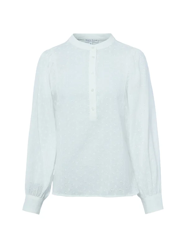 Blouse type: Klassieke blouse; Design: 1-knoops manchetten, Knop placket, Pofmouwen; Type sluiting: Knoopsluiting; Materiaal: Katoen; Motief: Effen; Kraag: Opstaande kraag; Details: Borduursels, Gedrapeerd; Extra's: Op staal naden, Met textuur; Pasvorm: Losse pasvorm; Armlengte: Lange mouw; Lengte: Normale lengte