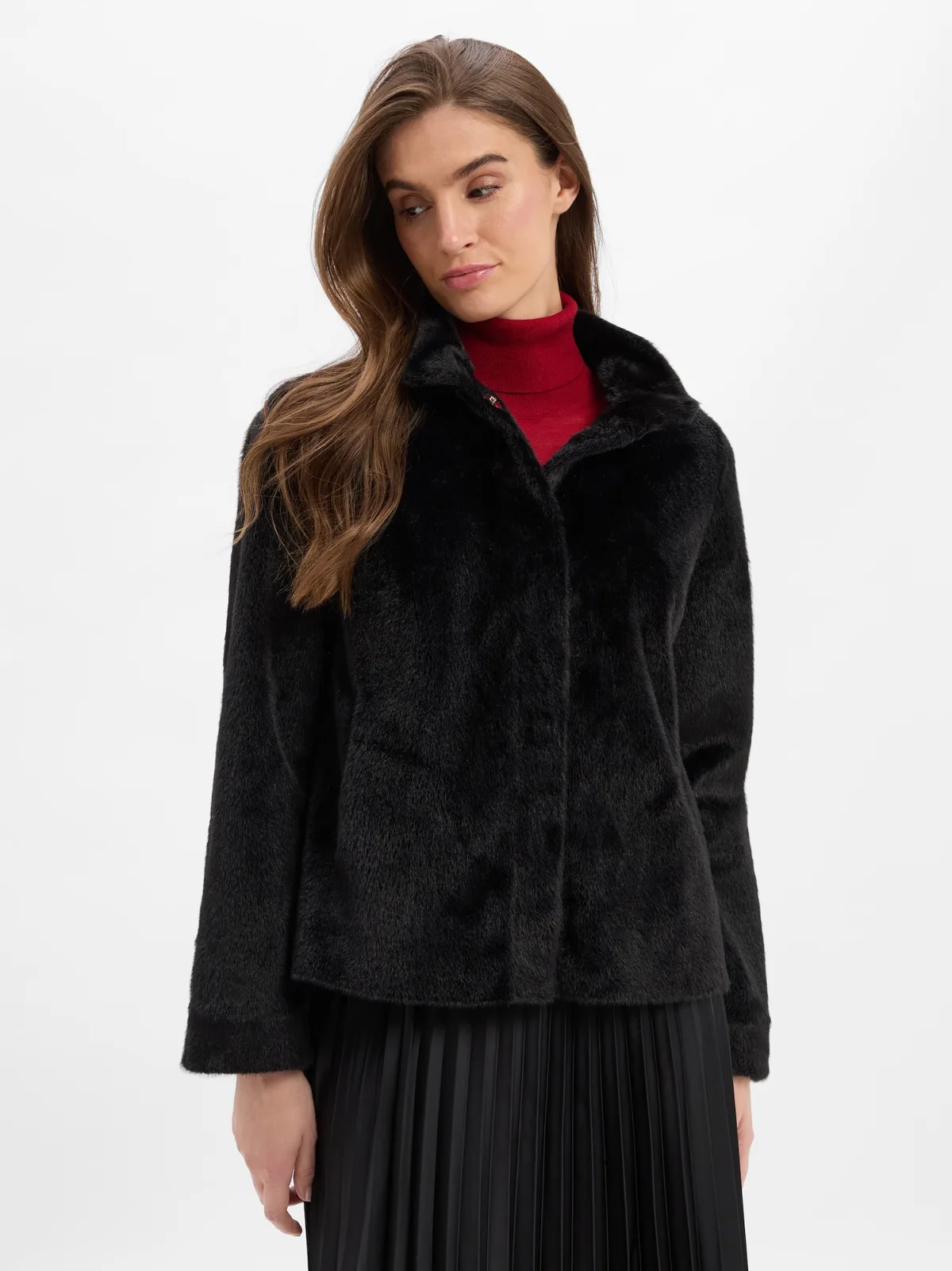 Design: Knop sluiting; Type sluiting: Drukknoop; Voering: Licht gevoerd; Materiaal: Nepbont; Motief: Effen; Extra's: Op staal naden; Pasvorm: Losse pasvorm