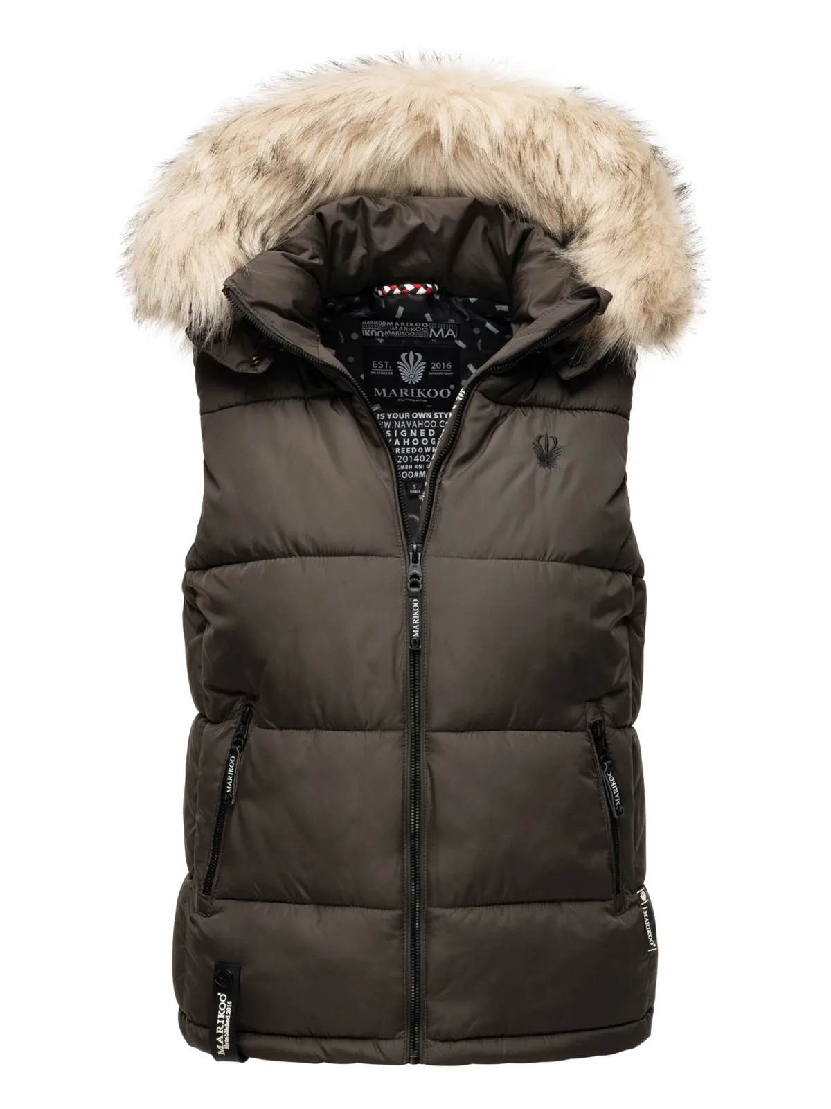 - De laagste prijs van Marikoo dames gewatteerd vest Eisflockchen met capuchon imitatiebontkraag werd gevonden op 27 april 2026 15:44.