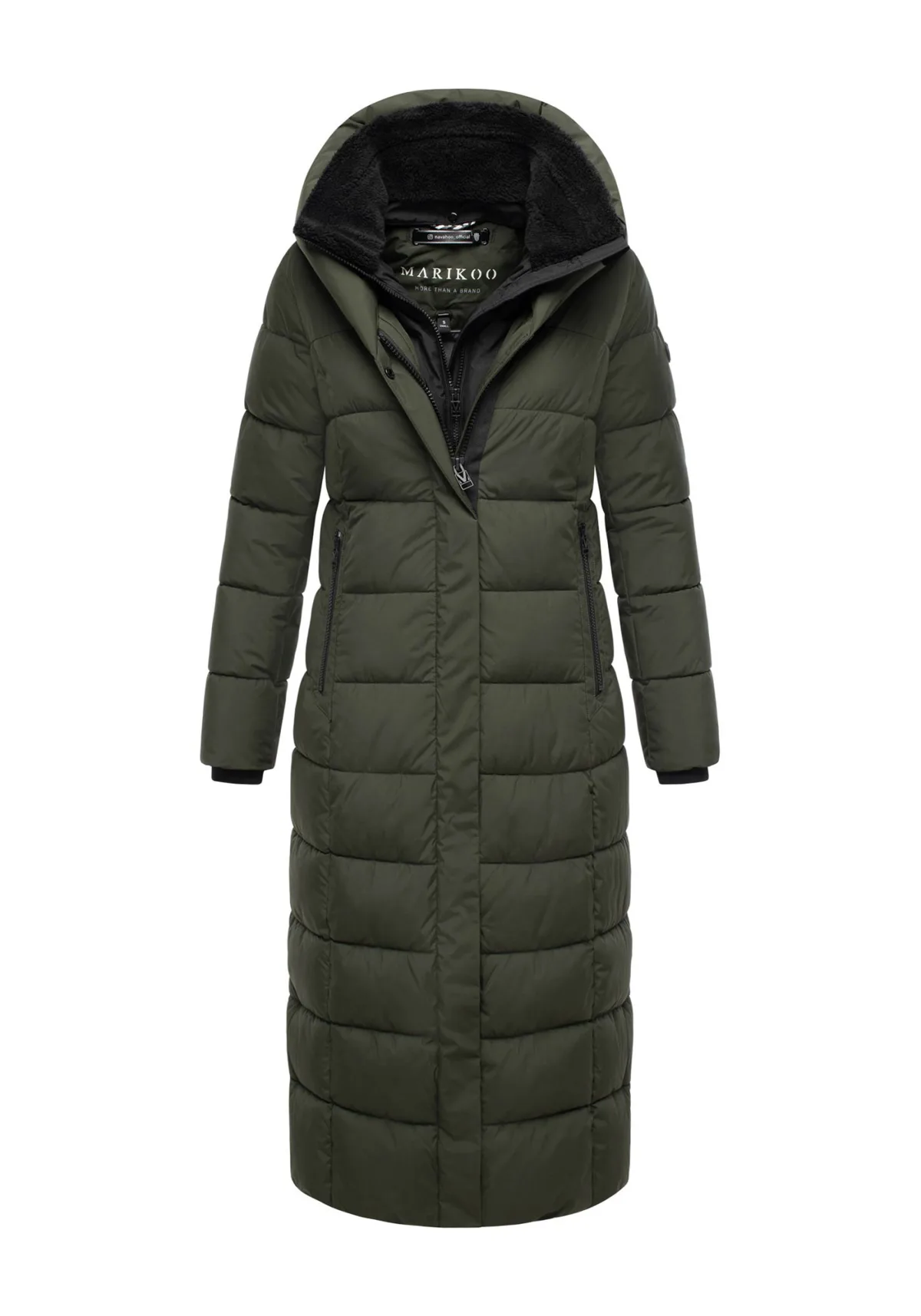De Marikoo Pakoraa gewatteerde mantel combineert tijdloos design met praktische details – ideaal voor koude winterdagen. De extra lange pasvorm beschermt betrouwbaar, terwijl de hoge kraag, vaste capuchon en afneembare teddy kraag extra comfort bieden. Bewegingsslits met drukknopen, een elastische tailleband en een tweewegrits met verborgen knoopsluiting zorgen voor draaggemak en een vrouwelijk silhouet. Met warme buitenzakken, twee binnenzakken en subtiele logo-accenten. Verkrijgbaar in 10 kleuren en maten S–5XL. Materiaal: Buitenkant/voering/vulling 100% polyester.