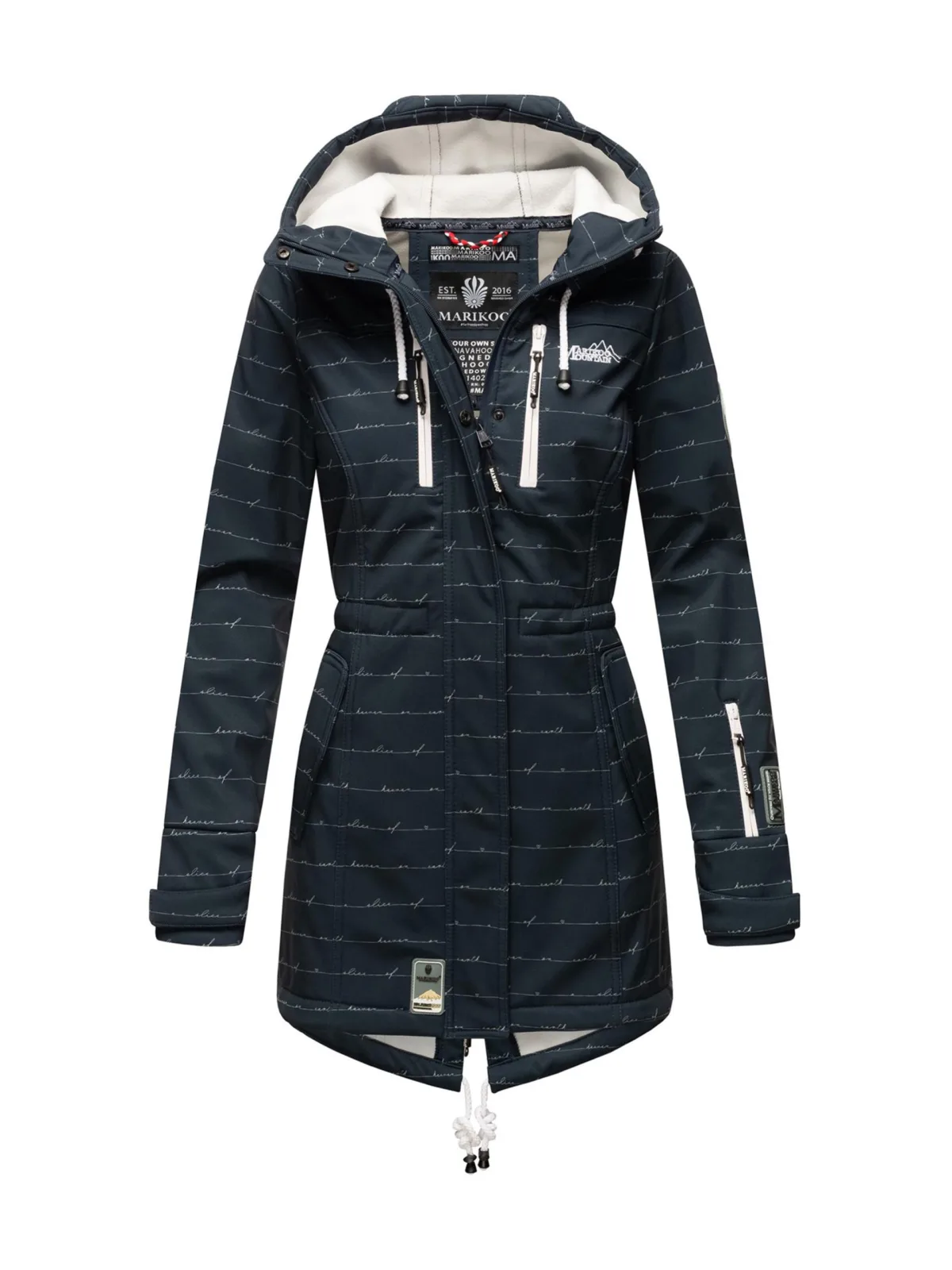 Marikoo dames winterjackAanbieden is een warme dames softshelljack van het trendy merk 'Marikoo'. Het model schittert met zijn waterafstotende buitenstof, de zeer goede afwerking, de vele zakken en de optimale pasvorm. Via het koord in de taille kun je de pasvorm aanpassen aan je eigen smaak. De jassen van Marikoo vertegenwoordigen altijd de huidige modetrend en zijn met veel aandacht voor detail gemaakt. Krijg een van deze premium jassen en laat je verrassen door de unieke prijs-kwaliteitsverhouding.Model: Cinnamon BitchBuitenstof: 98% polyester, 2% spandexBinnenstof: 100% polyesterZeer goede kwaliteit en detailrijk afgewerktSuper draagcomfort en optimale pasvormPerfecte snit, achterkant langer dan voorzijdeGevoerd kraag, beschermt tegen wind en kouDe gehele achterkant is bekleed met fleecestofTwee opgestikte borstzakken met ritsTwee zijzakken aan de voorkantTwee neppockets aan de voorkant met drukknoopAlle zakken zijn aan de binnenkant voorzien van warme fleeceTwee binnenzakken met rits, perfect voor telefoon of Mp3-spelerBinnenzakken met kleine opening, speciaal voor hoofdtelefoon / headset kabelBinnen tailleband voor optimale figuuraanpassingKap ook aan de binnenkant voorzien van fleecestof (niet verwijderbaar)Marikoo-logo op de linkerborstMarikoo-patch op de linkerbovenarmKlittenbandsluiting op de mouwen om de pasvorm aan te passenMouwen met warme geribbelde boordenWaterdichte rits aan de achterkantExtra knopenlijst beschermt tegen wind en kouLicht getailleerde snit, perfecte pasvormZeer comfortabel om te dragen