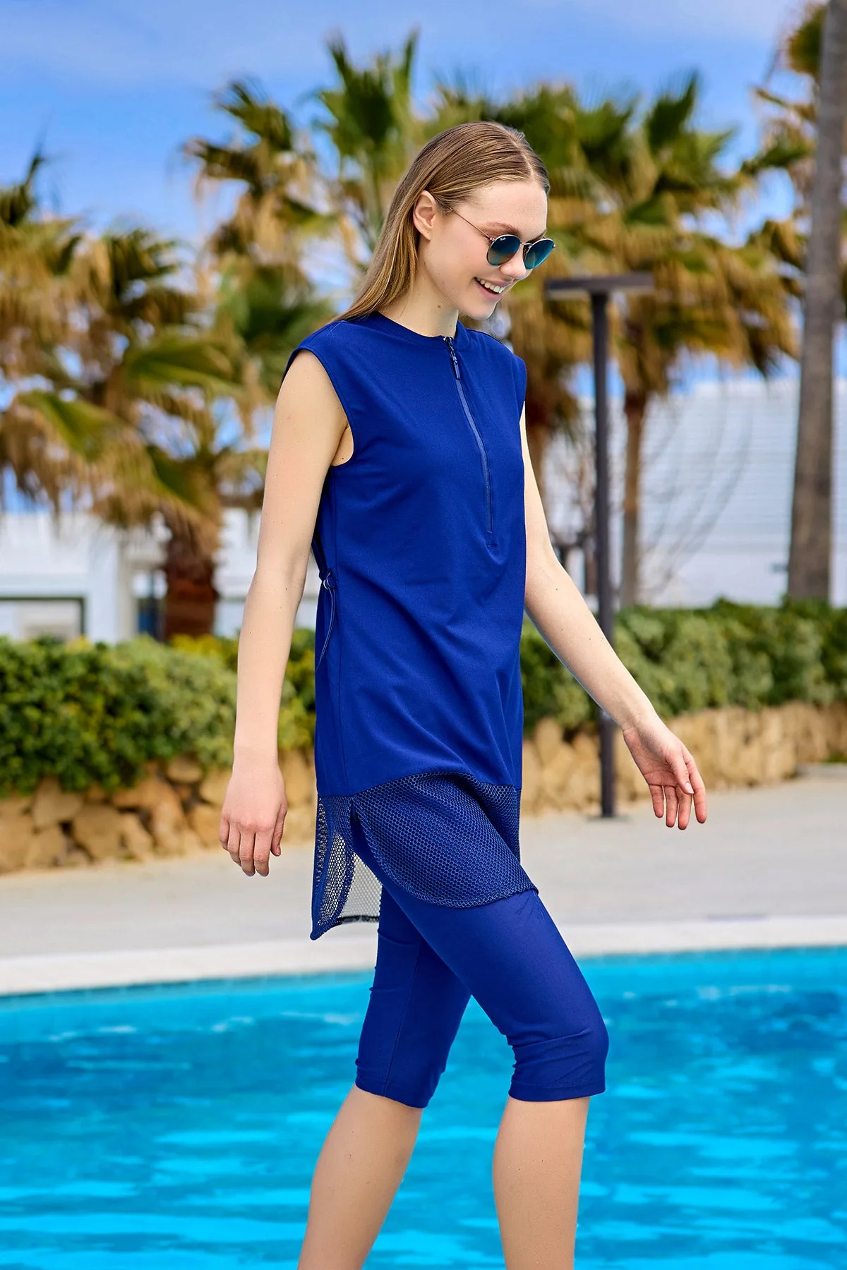 Marina Navy Half-Coverage Modest Swimsuit – H2507-2 Het Marina H2507-2 badpak met halve bedekking biedt een elegante strandlook met zijn eenvoudige silhouet en tule zoom. De cropped pijpen en waterafstotende stof zorgen voor comfort en functionaliteit op het strand of bij het zwembad. Opmerking van de redactie: Het H2507-2 model onderscheidt zich door zijn strakke design, met een zacht tule paneel aan de tuniekzoom en verstelbare trekkoordjes voor een perfecte pasvorm. De sneldrogende, waterafstotende stof garandeert comfort de hele dag door. Een praktische en chique keuze voor wie op zoek is naar een moderne, bescheiden strandlook. Productdetails: RITS De ritssluiting aan de voorkant zorgt voor draagcomfort en geeft de look een sportieve touch. VERSTELBARE TAILLE De verstelbare trekkoordjes aan de zijkant stellen je in staat de lengte van de tuniek aan te passen aan je eigen stijl. WATERAFSTOTENDE STOF De speciaal behandelde stof stoot water af en droogt snel voor langdurig comfort de hele dag door. Productkenmerken Stretchstof: 78% Polyamide PA, 22% Elastaan LYCRA® (legging) Flexibele geweven stof: 90% Polyester, 10% Elastaan (tuniek) UPF50+ stof blokkeert 98% van de schadelijke UVA- en UVB-stralen Standard 100 by Oeko-Tex® gecertificeerde stof Waterafstotend en sneldrogend materiaal Verstelbare trekkoordstopper aan de zijkant Functionele ritssluiting aan de voorkant voor gebruiksgemak Set bevat: Tuniek, legging en sportbeha – 3-delig Geschikt om mee te zwemmen, uitneembare vulling, kan met of zonder vulling gedragen worden Maat van het model: S, Lengte tuniek: 86 cm, Breedte: 46 cm De breedte neemt toe met +2,5 cm en de lengte met +1 cm tussen de maten Afmetingen model: Lengte 178 cm, Buste 83 cm, Taille 60 cm, Heupen 90 cm