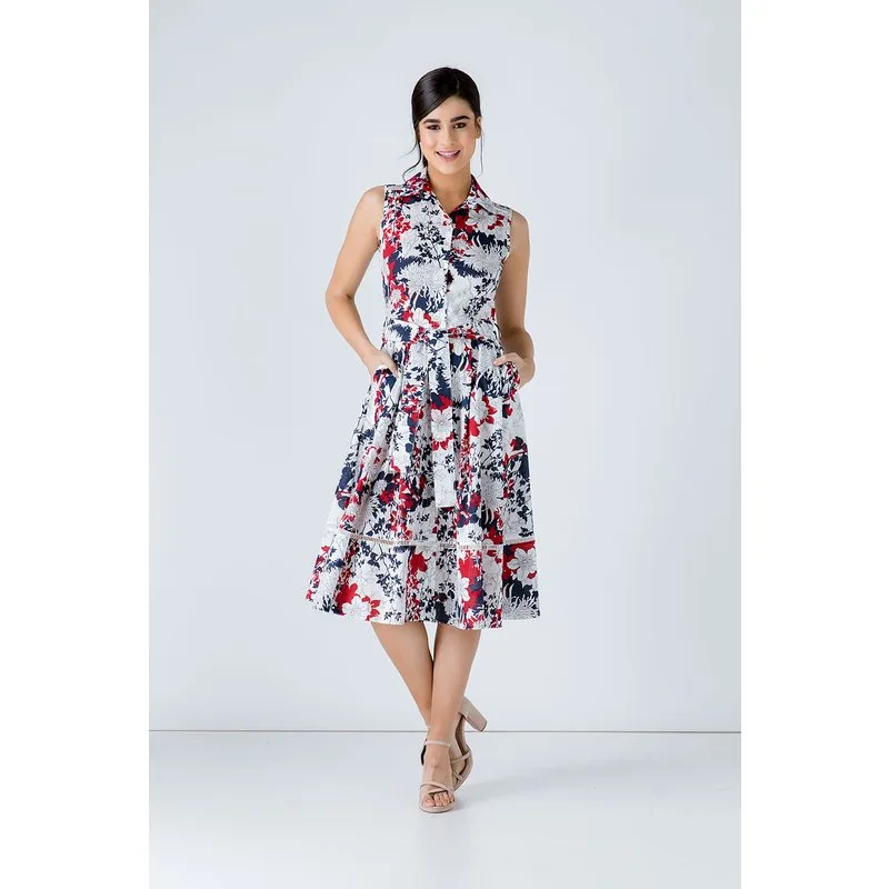 Mouwloze jurk met bloemenprint van geweven popeline katoen. Kraag en sluiting vooraan tot aan de zoom met decoratieve schelpvormige knopen. Decoratieve ecru geperforeerde vlecht onder de schouders voor en achter en 19 cm van de zoom. Naaddetail aan de voorkant. Darts bij de buste. Ceintuur in dezelfde stof, 5cm breed, met plooien onderaan voor en achter. 2 binnenzakken vooraan. Ons model is 172cm en draagt maat 36/S. Afmetingen voor maat 36 (in cm): Schouder -34; Borst-42; Taille-36; Onderkant-68; Lichaamslengte-112. 100% KATOEN