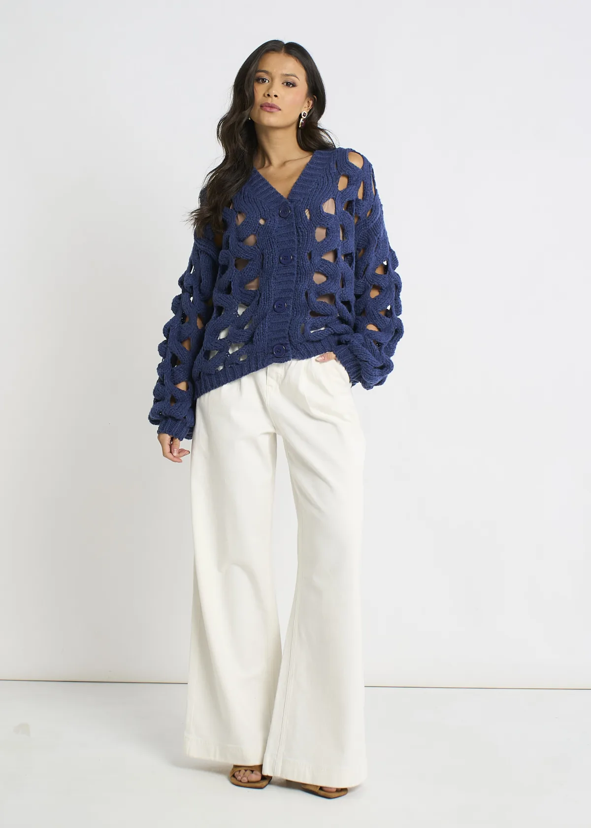 Maak een statement met dit marineblauwe grof gebreide vest, ontworpen voor wie houdt van textuur en comfort. Het opvallende holle breipatroon zorgt voor visuele diepte, terwijl de ruime pasvorm gemakkelijk combineren en bewegen mogelijk maakt. Dit kledingstuk is gemaakt om net zo goed te voelen als het eruitziet en past even goed over een slipdress als in combinatie met denim voor een moeiteloos stoere look.