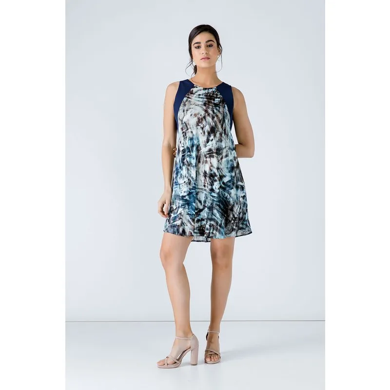 Deze zomerjurk met print is gemaakt van viscose-elastaan. Op de schouders zit marineblauwe geweven crêpestof. Het is mouwloos en heeft een ronde halslijn. Het sluit met een decoratieve plastic knoop op de rug. Het is ongevoerd en heeft een A-lijn silhouet.