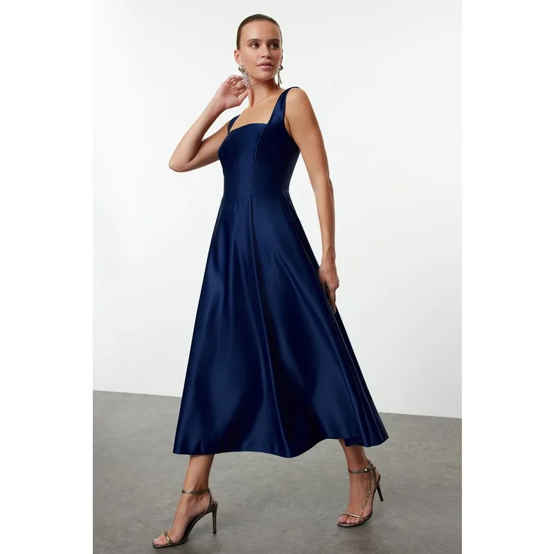 Marineblauwe rechte midi cocktailjurk met wijde pasvorm