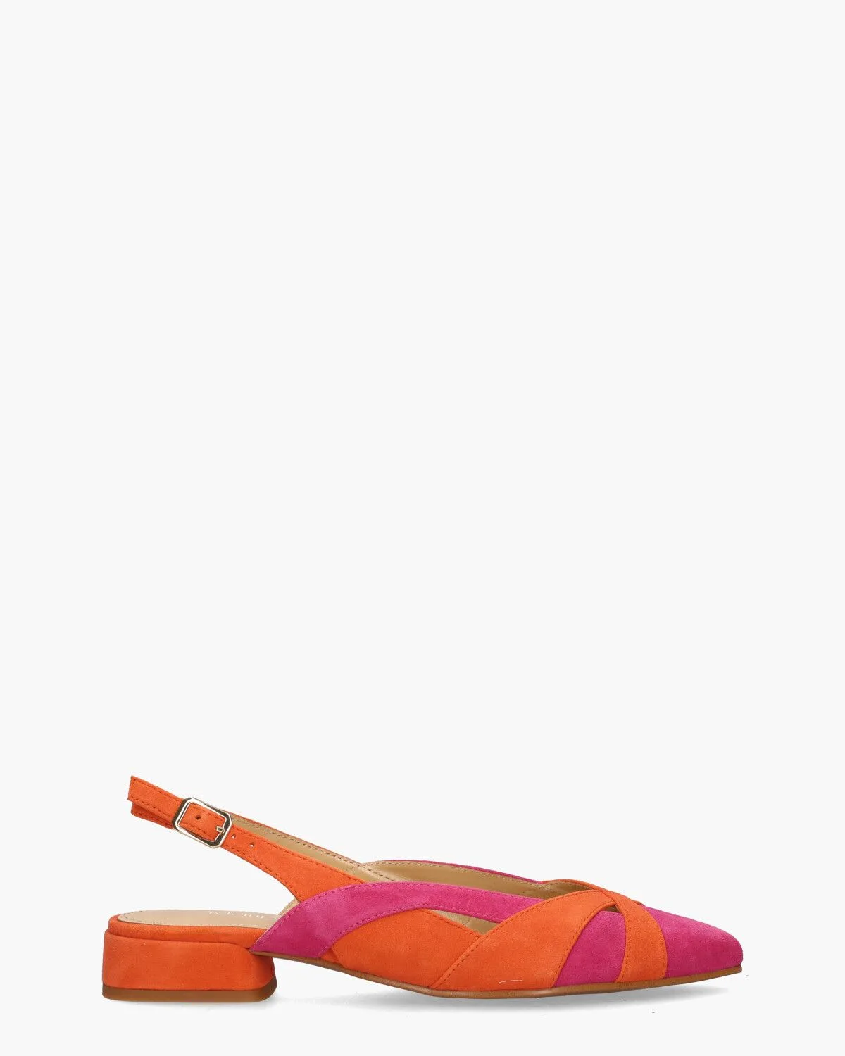 Slingbackpumps voor dames Anouk-Ma van het merk Maripé. Dit model op een spitse leest heeft een bovenzijde van zacht suède in een felroze en oranje tint. De binnenkant en het voetbed zijn in leer uitgevoerd. Met het gespje kun je het enkelbandje verstellen. Het met suède beklede hakje is circa 2,5 cm hoog. Op de kunststof/rubberen zool loop