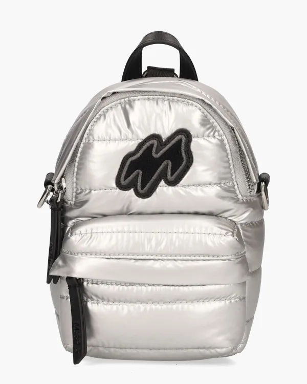 De MRP Backpack V.4 van MRP By Maripé is een stijlvolle en praktische rugzak in een opvallende zilveren uitvoering. Gemaakt van doorgestikt polyester en afgewerkt met zwarte kunstlederen en stoffen details, straalt deze rugzak luxe uit. Het ruime hoofdvak sluit veilig af met een rits, terwijl het voorvak ideaal is voor kleinere spullen. De