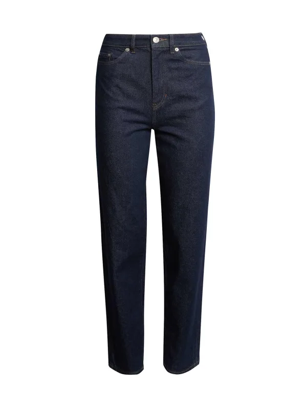 Design: Flare, 5-pocket-style; Type sluiting: Ritssluiting; Materiaal: Denim; Motief: Effen; Extra's: Contrasterende naden, Riemlussen; Wassing: Rinsed/dark washed; Lengte: Lang/maxi; Pasvorm: Regular; Taillehoogte: High waist
