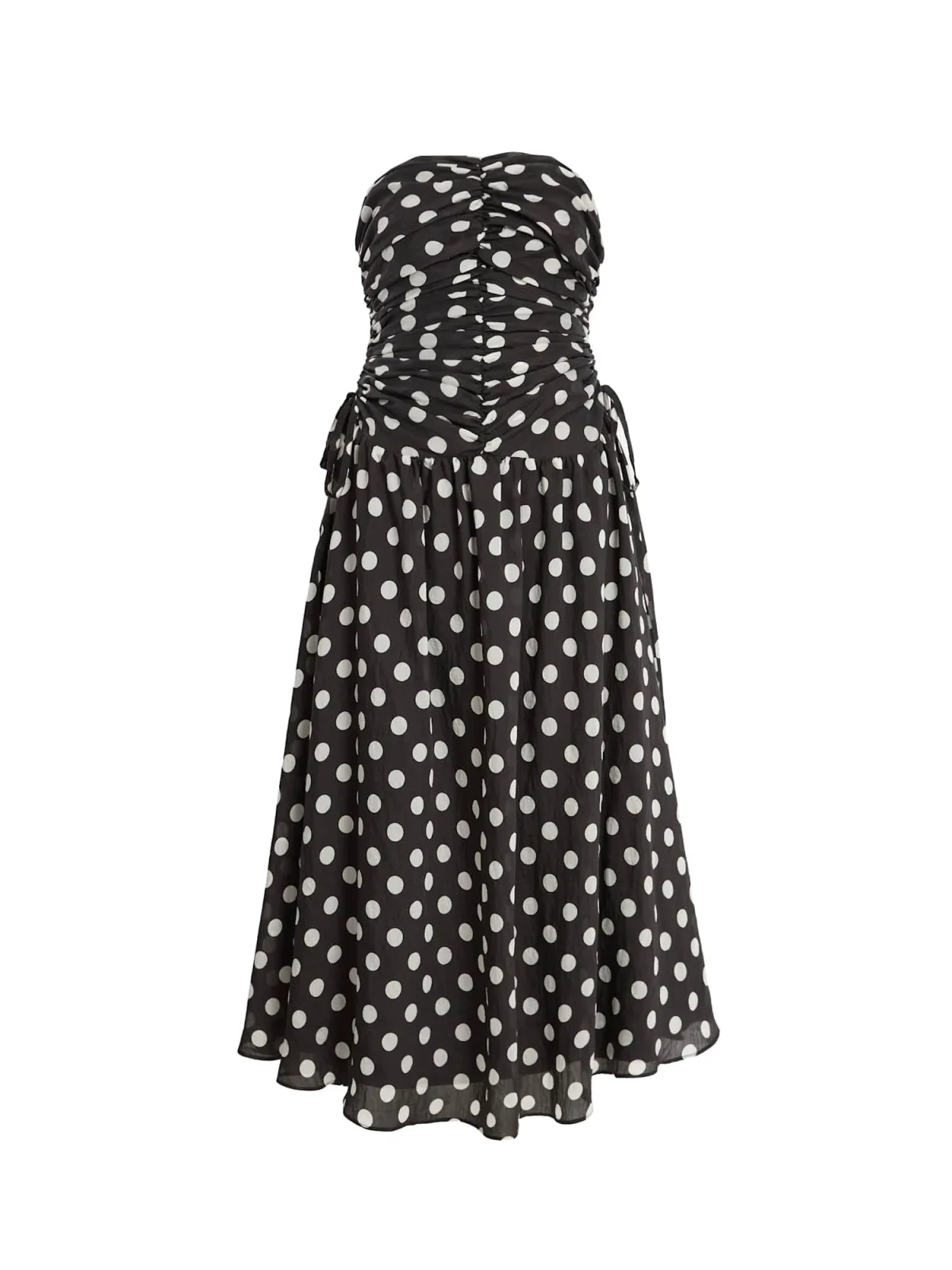 Halstype: Carmen hals; Motief: Gestippeld; Soort bandjes: Bandeau; Lengte: 7/8 lengte; Pasvorm: Normale pasvorm; Armlengte: Mouwloos