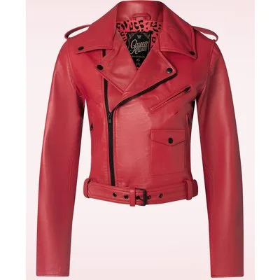 ”Baby doll, you need some rock ’n roll!” Dit stoere Marlon biker jasje is uitgevoerd in kwalitatief hoogwaardig en soepel dieprood (100%) leder en volledig gevoerd met een leopard stofje. * Echt leder! * Puntige kraag met drukknopen * Geheel gevoerd en voorzien van een binnenzakje met ritssluiting * Rits- en riemsluiting * It has pockets! * Lang genoeg om op een normale heupbroek te dragen