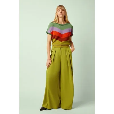 ''Peace in my soul, love in my heart and these trousers on my body!'' Deze pantalon is uitgevoerd in een dunne en soepele, goudgroene stof met een hele lichte stretch die heerlijk luchtig en óh zó comfy draagt. * High waist voor een super vrouwelijk silhouet * Rits- en haaksluiting voorzijde * Riemlussen * Rechte, wijde pijp met platte plooien