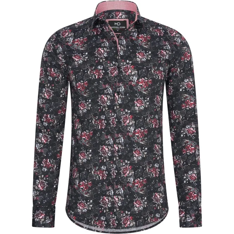 Italiaans overhemd voor heren | slim fit pasvorm | Marshall Denim | Lichte stretch Luxe heren overhemd met hoge kraag van het Italiaanse stijl merk Marshall Denim. Dit Moda Italia Fashion overhemd met kwaliteitsstof is voorzien van een all over bloemenprint en heeft een slim fit pasvorm. Kleur : Zwart