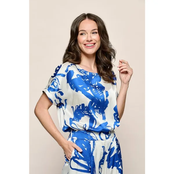Satijnlook top met abstracte bloemenprint in kobaltblauwDe Martha top in kobaltblauw en wit is een opvallend ontwerp met een prachtig abstract bloemenmotief dat een krachtig visueel effect creëert en iedere look een eigentijdse uitstraling geeft. Het diepe kobaltblauw wordt extra versterkt door de luxueuze satijnlook van de stof, die het licht subtiel vangt en het dessin meer diepte verleent.Deze dames top is ontworpen met een elegante, brede ronde hals en fijn afgewerkte aangesneden mouwen die soepel over de schouders vallen. De recht vallende pasvorm reikt tot op de heup en dankzij de toevoeging van stretch voelt de top comfortabel en flatterend aan. Aan de achterzijde zorgen zorgvuldig geplaatste plooien voor extra bewegingsvrijheid en een perfecte belijning.De Martha top weerspiegelt de visie van Mart Visser: stijlvolle mode waarin comfort en luxe naadloos samenkomen. De satijnachtige stof voelt zijdezacht aan op de huid en benadrukt het hoogwaardige karakter van dit statement piece. Combineer de top met een bijpassende rok voor een krachtig en compleet silhouet. Naast de blauwe uitvoering is de Martha top ook verkrijgbaar in een elegante roze variant.
